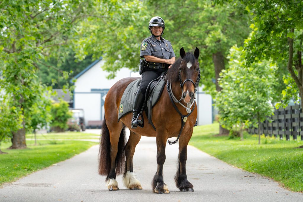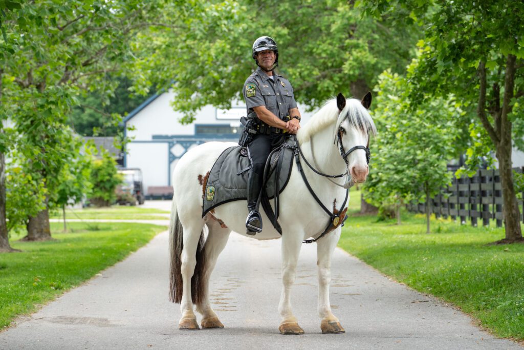Located in the center of the park, the Kentucky Horse Park Mounted Police barn houses our equine police force and their horses. Officers provide daily barn tours, as well as perform their patrol duties by horseback, motor vehicle, golf cart, or on foot. The officers play an important role in the park, providing effective crowd control and being the first to respond during emergencies. The KHP Mounted Police can be seen patrolling the parkโs 1,200+ acres 24 hours a day, 365 days a year.